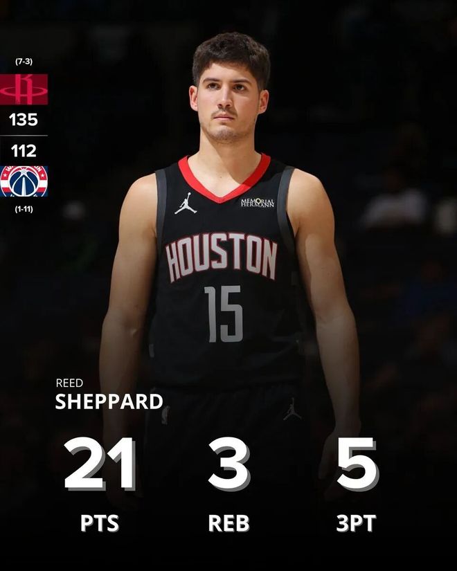 火箭的上一场常规赛,主场135-112击败奇才,这场火箭6人得分上双,其中,杜兰特、申京、阿门、贾巴里史密斯都属于常规操作,重点在谢泼德。